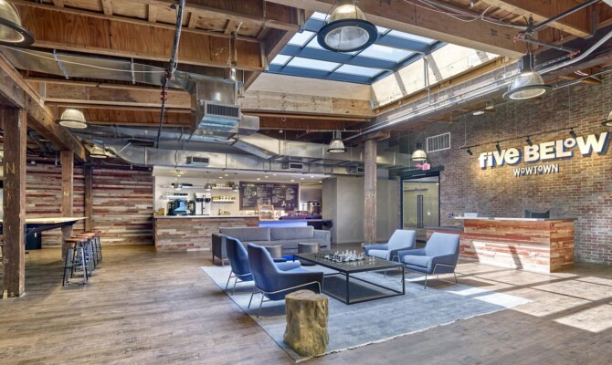 Recently Officeworks PA completed the Five Below Headquarters Project located at 701 Market Street in Philadelphia. Five Below Inc. is an American publicly-held chain of discount stores in America that sells products $5 and below. The project team included the design firm D2 Solutions, the construction manager was Structure Tone and serving as project manager was CBRE. The 117,000 square foot 3 floor project included 375 workstations, training rooms, conference rooms, coffee bar and a cafe. It stretched over 3 floors.