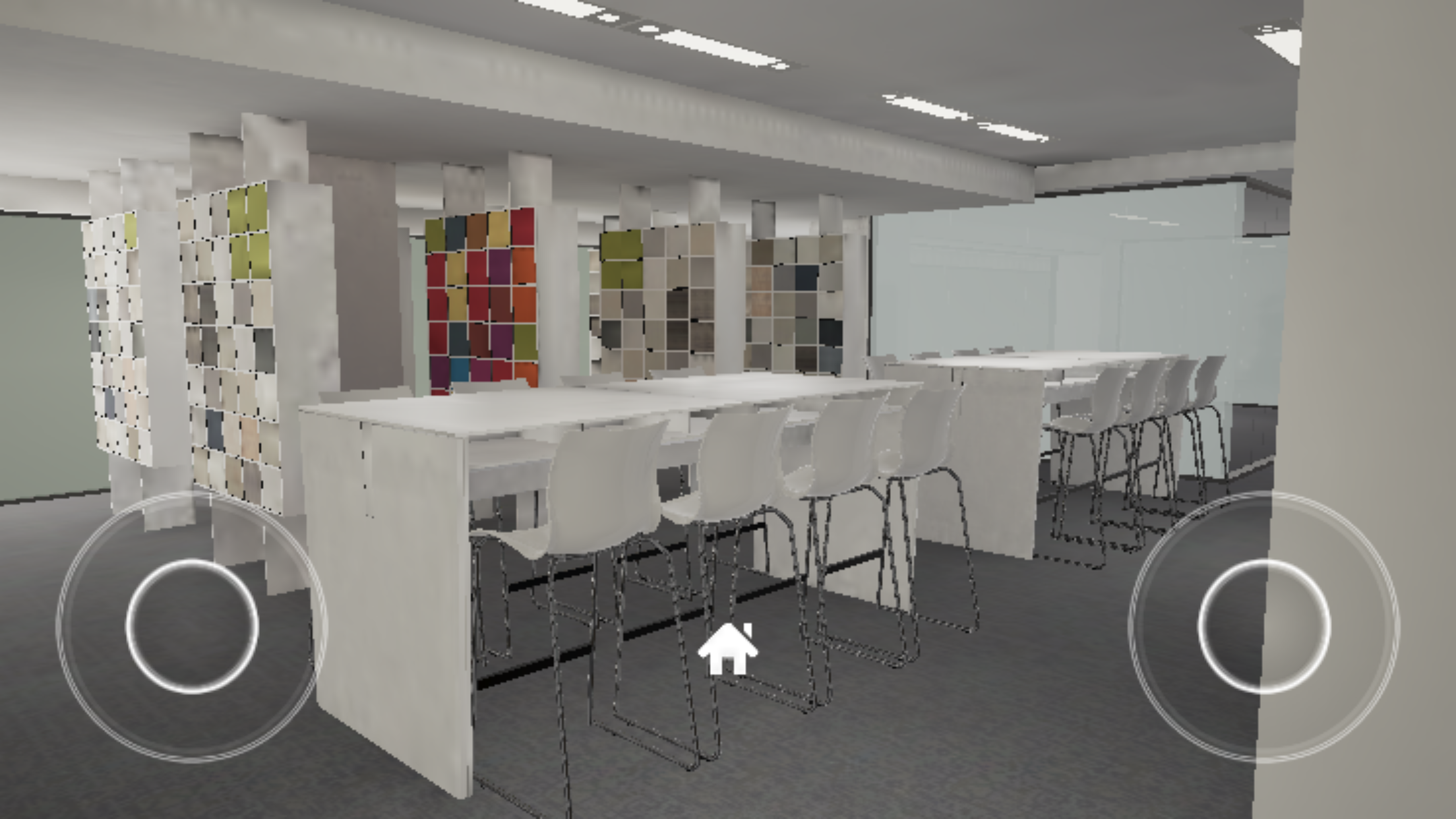 In the program, there are pre-determined tours each with a different focus; Traditional, Modern and Technology. Tours can also be chosen via ethonomic principles ranging from open workspaces to private workspaces, collaboration and more. In addition, users have the ability to use two virtual joysticks to wander around, looking at the 3D showroom from any angle they choose.